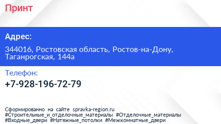 Принт по адресу 344016, Ростовская область, Ростов-на-Дону, Таганрогская, 144а в дальнейшем Организация, размещена в следующих категориях: