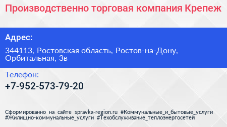 Производственно-торговая компания Крепеж по адресу 344113, Ростовская область, Ростов-на-Дону, Орбитальная, 3в в дальнейшем Организация, размещена в следующих категориях: