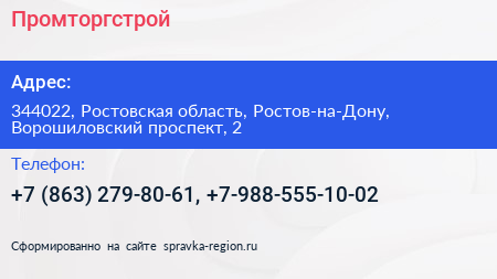 Промторгстрой по адресу 344022, Ростовская область, Ростов-на-Дону, Ворошиловский проспект, 2 в дальнейшем Организация, размещена в следующих категориях:
