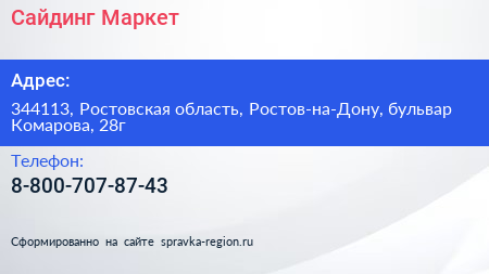 Сайдинг-Маркет по адресу 344113, Ростовская область, Ростов-на-Дону, бульвар Комарова, 28г в дальнейшем Организация, размещена в следующих категориях: