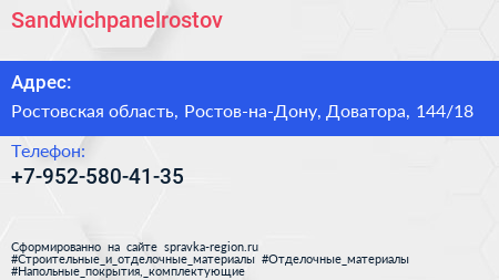 Sandwichpanelrostov по адресу Ростовская область, Ростов-на-Дону, Доватора, 144/18 в дальнейшем Организация, размещена в следующих категориях: