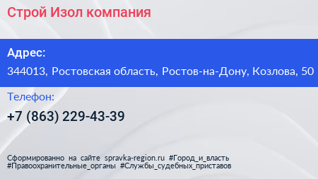 Строй-Изол, компания по адресу 344013, Ростовская область, Ростов-на-Дону, Козлова, 50 в дальнейшем Организация, размещена в следующих категориях: