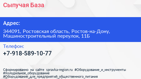 Сыпучая База по адресу 344091, Ростовская область, Ростов-на-Дону, Машиностроительный переулок, 11Б в дальнейшем Организация, размещена в следующих категориях: