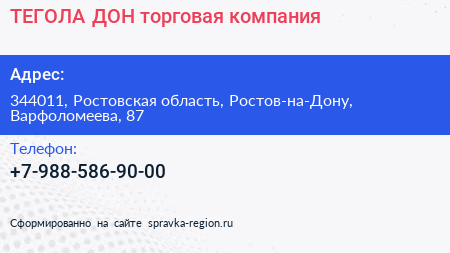 ТЕГОЛА-ДОН, торговая компания по адресу 344011, Ростовская область, Ростов-на-Дону, Варфоломеева, 87 в дальнейшем Организация, размещена в следующих категориях: