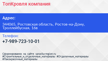 ТопКровля, компания по адресу 344065, Ростовская область, Ростов-на-Дону, Троллейбусная, 16в в дальнейшем Организация, размещена в следующих категориях: