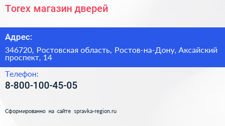 Torex, магазин дверей по адресу 346720, Ростовская область, Ростов-на-Дону, Аксайский проспект, 14 в дальнейшем Организация, размещена в следующих категориях: