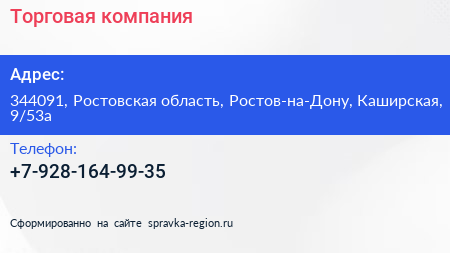 Торговая компания по адресу 344091, Ростовская область, Ростов-на-Дону, Каширская, 9/53а в дальнейшем Организация, размещена в следующих категориях: