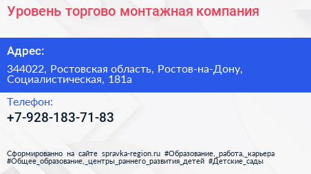 Уровень, торгово-монтажная компания по адресу 344022, Ростовская область, Ростов-на-Дону, Социалистическая, 181а в дальнейшем Организация, размещена в следующих категориях: