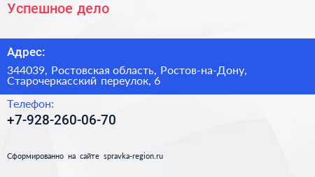 Успешное дело по адресу 344039, Ростовская область, Ростов-на-Дону, Старочеркасский переулок, 6 в дальнейшем Организация, размещена в следующих категориях: