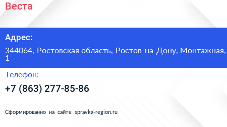 Веста по адресу 344064, Ростовская область, Ростов-на-Дону, Монтажная, 1 в дальнейшем Организация, размещена в следующих категориях: