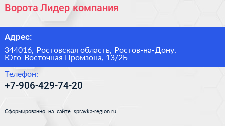 Ворота Лидер, компания по адресу 344016, Ростовская область, Ростов-на-Дону, Юго-Восточная Промзона, 13/2Б в дальнейшем Организация, размещена в следующих категориях: