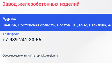 Завод железобетонных изделий по адресу 344064, Ростовская область, Ростов-на-Дону, Вавилова, 46 в дальнейшем Организация, размещена в следующих категориях: