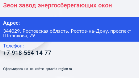Зеон, завод энергосберегающих окон по адресу 344029, Ростовская область, Ростов-на-Дону, проспект Шолохова, 79 в дальнейшем Организация, размещена в следующих категориях: