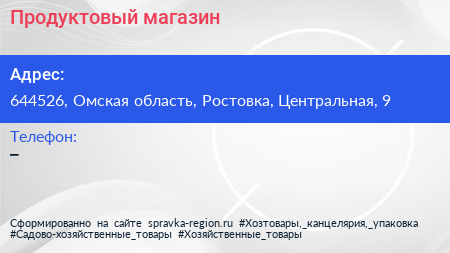 Продуктовый магазин по адресу 644526, Омская область, Ростовка, Центральная, 9 в дальнейшем Организация, размещена в следующих категориях: