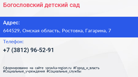 Богословский, детский сад по адресу 644529, Омская область, Ростовка, Гагарина, 7 в дальнейшем Организация, размещена в следующих категориях: