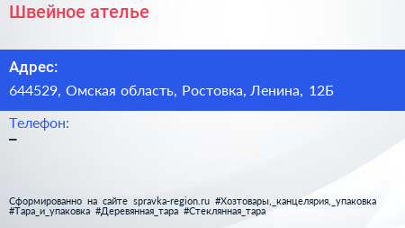 Швейное ателье по адресу 644529, Омская область, Ростовка, Ленина, 12Б в дальнейшем Организация, размещена в следующих категориях: