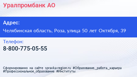Уралпромбанк, АО по адресу Челябинская область, Роза, улица 50 лет Октября, 39 в дальнейшем Организация, размещена в следующих категориях: