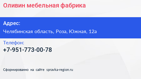 Оливин, мебельная фабрика по адресу Челябинская область, Роза, Южная, 12а в дальнейшем Организация, размещена в следующих категориях: