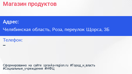 Магазин продуктов по адресу Челябинская область, Роза, переулок Щорса, 3Б в дальнейшем Организация, размещена в следующих категориях: