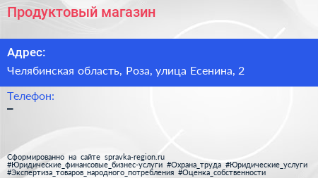 Продуктовый магазин по адресу Челябинская область, Роза, улица Есенина, 2 в дальнейшем Организация, размещена в следующих категориях: