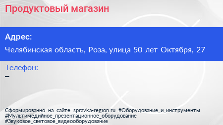 Продуктовый магазин по адресу Челябинская область, Роза, улица 50 лет Октября, 27 в дальнейшем Организация, размещена в следующих категориях: