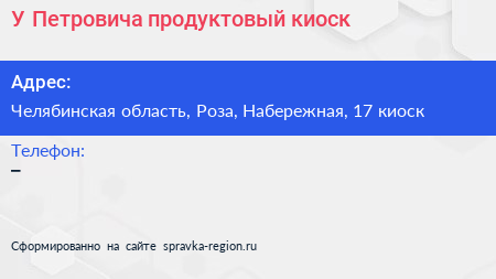 У Петровича, продуктовый киоск по адресу Челябинская область, Роза, Набережная, 17 киоск в дальнейшем Организация, размещена в следующих категориях:
