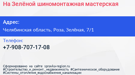 На Зелёной, шиномонтажная мастерская по адресу Челябинская область, Роза, Зелёная, 7/1 в дальнейшем Организация, размещена в следующих категориях: