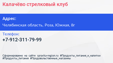 Калачёво, стрелковый клуб по адресу Челябинская область, Роза, Южная, 8г в дальнейшем Организация, размещена в следующих категориях: