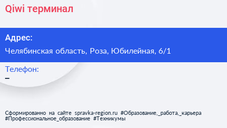 Qiwi, терминал по адресу Челябинская область, Роза, Юбилейная, 6/1 в дальнейшем Организация, размещена в следующих категориях:
