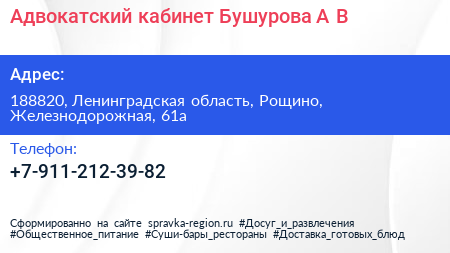 Адвокатский кабинет Бушурова А.В. по адресу 188820, Ленинградская область, Рощино, Железнодорожная, 61а в дальнейшем Организация, размещена в следующих категориях: