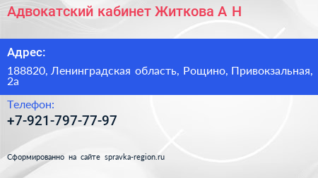 Адвокатский кабинет Житкова А.Н. по адресу 188820, Ленинградская область, Рощино, Привокзальная, 2а в дальнейшем Организация, размещена в следующих категориях: