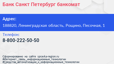 Банк Санкт-Петербург, банкомат по адресу 188820, Ленинградская область, Рощино, Песочная, 1 в дальнейшем Организация, размещена в следующих категориях: