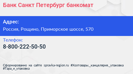 Банк Санкт-Петербург, банкомат по адресу Банк Санкт-Петербург, 570 литЕ, Приморское шоссе, Коттеджный поселок "Янтарный", Зеленогорск, Санкт-Петербург, Северо-Западный федеральный округ, 197720, Россия в дальнейшем Организация, размещена в следующих категориях:
