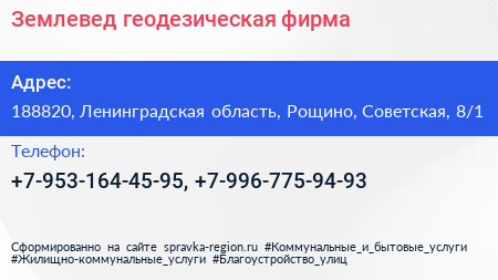 Землевед, геодезическая фирма по адресу 188820, Ленинградская область, Рощино, Советская, 8/1 в дальнейшем Организация, размещена в следующих категориях: