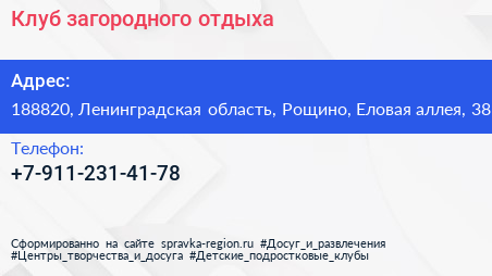 Клуб загородного отдыха по адресу 188820, Ленинградская область, Рощино, Еловая аллея, 38 в дальнейшем Организация, размещена в следующих категориях: