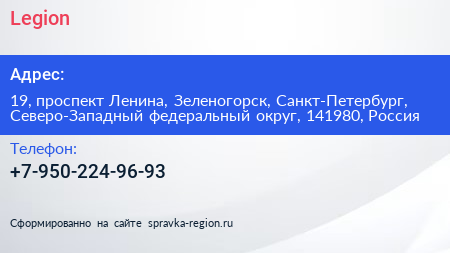 Legion по адресу 19, проспект Ленина, Зеленогорск, Санкт-Петербург, Северо-Западный федеральный округ, 141980, Россия в дальнейшем Организация, размещена в следующих категориях: