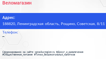 Веломагазин по адресу 188820, Ленинградская область, Рощино, Советская, 8/11 в дальнейшем Организация, размещена в следующих категориях: