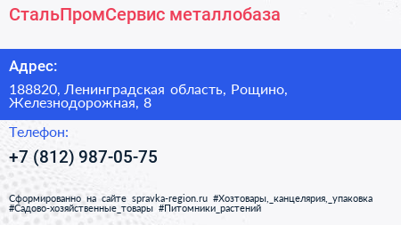 СтальПромСервис, металлобаза по адресу 188820, Ленинградская область, Рощино, Железнодорожная, 8 в дальнейшем Организация, размещена в следующих категориях: