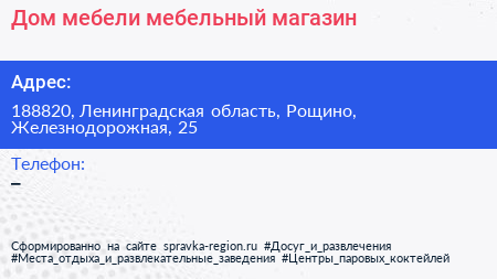Дом мебели, мебельный магазин по адресу 188820, Ленинградская область, Рощино, Железнодорожная, 25 в дальнейшем Организация, размещена в следующих категориях: