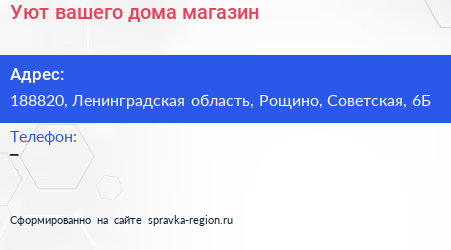 Уют вашего дома, магазин по адресу 188820, Ленинградская область, Рощино, Советская, 6Б в дальнейшем Организация, размещена в следующих категориях: