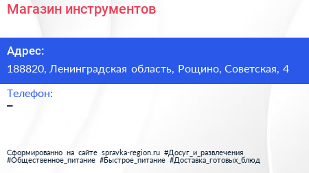 Магазин инструментов по адресу 188820, Ленинградская область, Рощино, Советская, 4 в дальнейшем Организация, размещена в следующих категориях: