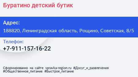 Буратино, детский бутик по адресу 188820, Ленинградская область, Рощино, Советская, 8/5 в дальнейшем Организация, размещена в следующих категориях: