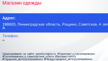 Магазин одежды по адресу 188820, Ленинградская область, Рощино, Советская, 4 лит А в дальнейшем Организация, размещена в следующих категориях: