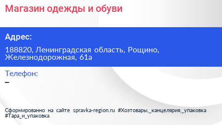 Магазин одежды и обуви по адресу 188820, Ленинградская область, Рощино, Железнодорожная, 61а в дальнейшем Организация, размещена в следующих категориях: