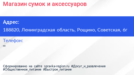 Магазин сумок и аксессуаров по адресу 188820, Ленинградская область, Рощино, Советская, 6г в дальнейшем Организация, размещена в следующих категориях: