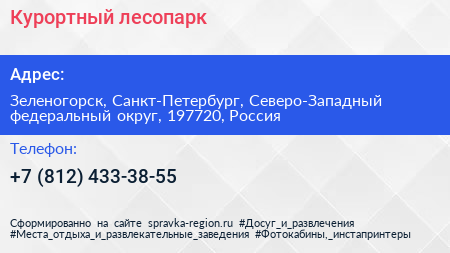 Курортный лесопарк по адресу Зеленогорск, Санкт-Петербург, Северо-Западный федеральный округ, 197720, Россия в дальнейшем Организация, размещена в следующих категориях: