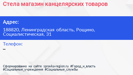 Стела, магазин канцелярских товаров по адресу 188820, Ленинградская область, Рощино, Социалистическая, 31 в дальнейшем Организация, размещена в следующих категориях: