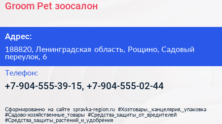 Groom Pet, зоосалон по адресу 188820, Ленинградская область, Рощино, Садовый переулок, 6 в дальнейшем Организация, размещена в следующих категориях: