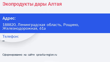 Экопродукты дары Алтая по адресу 188820, Ленинградская область, Рощино, Железнодорожная, 61а в дальнейшем Организация, размещена в следующих категориях: