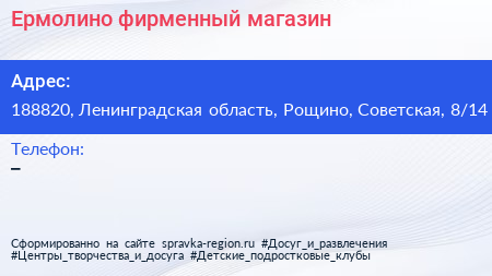 Ермолино, фирменный магазин по адресу 188820, Ленинградская область, Рощино, Советская, 8/14 в дальнейшем Организация, размещена в следующих категориях: